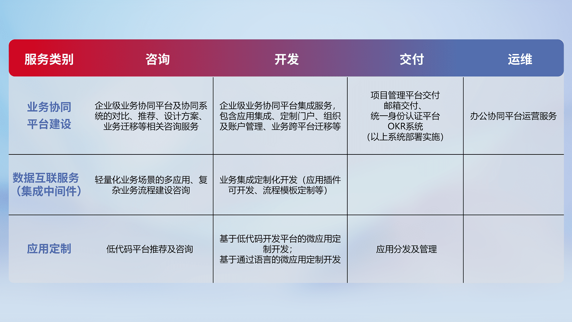 针对钉钉、、、企微、、、、IDaas等平台级产品提供产品的规划、、、方案、、、交付、、定制化开发等服务,,实现如统一协同办公、、智能客户服务、、、混合会议管理、、、、智能数据查询、、、等业务场景,,,实现数字化转型。。